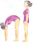 등을 똑바로 펴고 선 자세에서 숨을 내쉬면서 무릎의 힘을 약간 빼고 상반신을 앞으로 굽혀 손 끝을 바닥에 댄 후 다시 원상태로 천천히 몸을 일으킵니다(5회씩, 1일 3회).