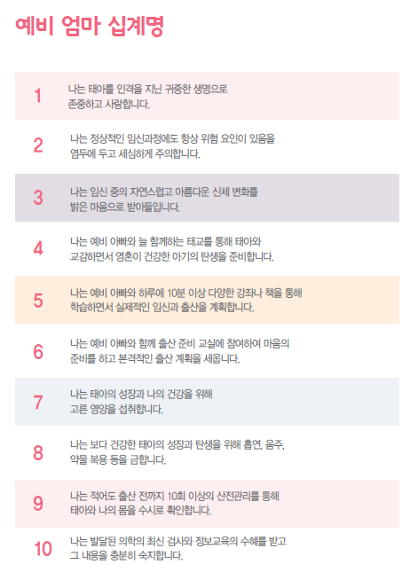 4. 태교는 임산부 혼자 하는 것이 아니니 온 가족이 항상 공경하고 말과 행동을 삼가며 분하고 흉하거나 급한 일은 임산부에게 말하지 말아야 합니다.