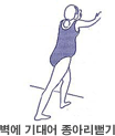 - 머리, 가슴, 엉덩이와 오른쪽 발뒤꿈치가 일직선 상에 놓이도록 하면서 벽을 향해 기대어 섭니다.